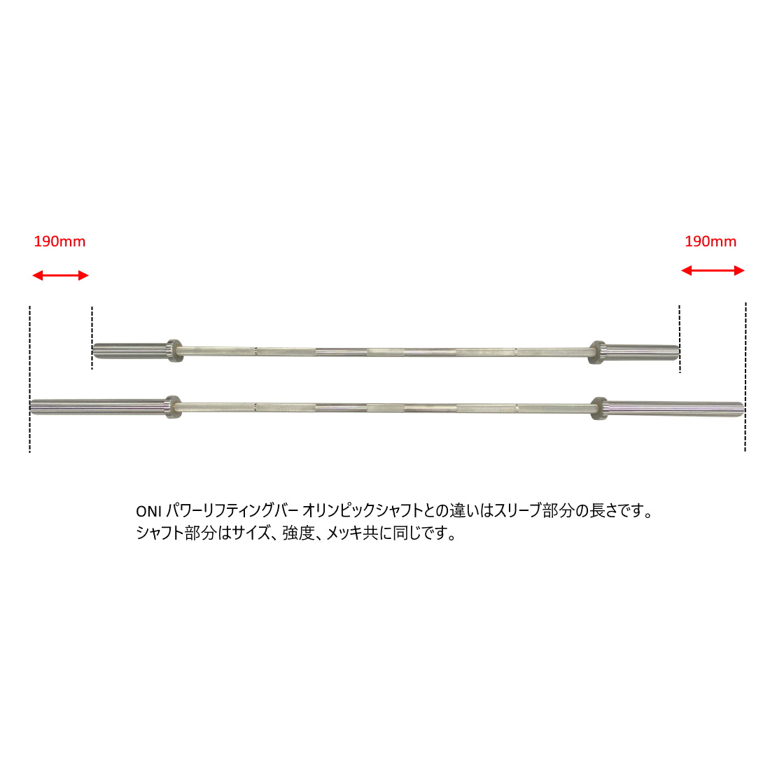 ONI パワーリフティングバー ショートスリーブは、シャフト部分はONI パワーリフティングバー オリンピックシャフトと全く同じ長さの1310mmです。