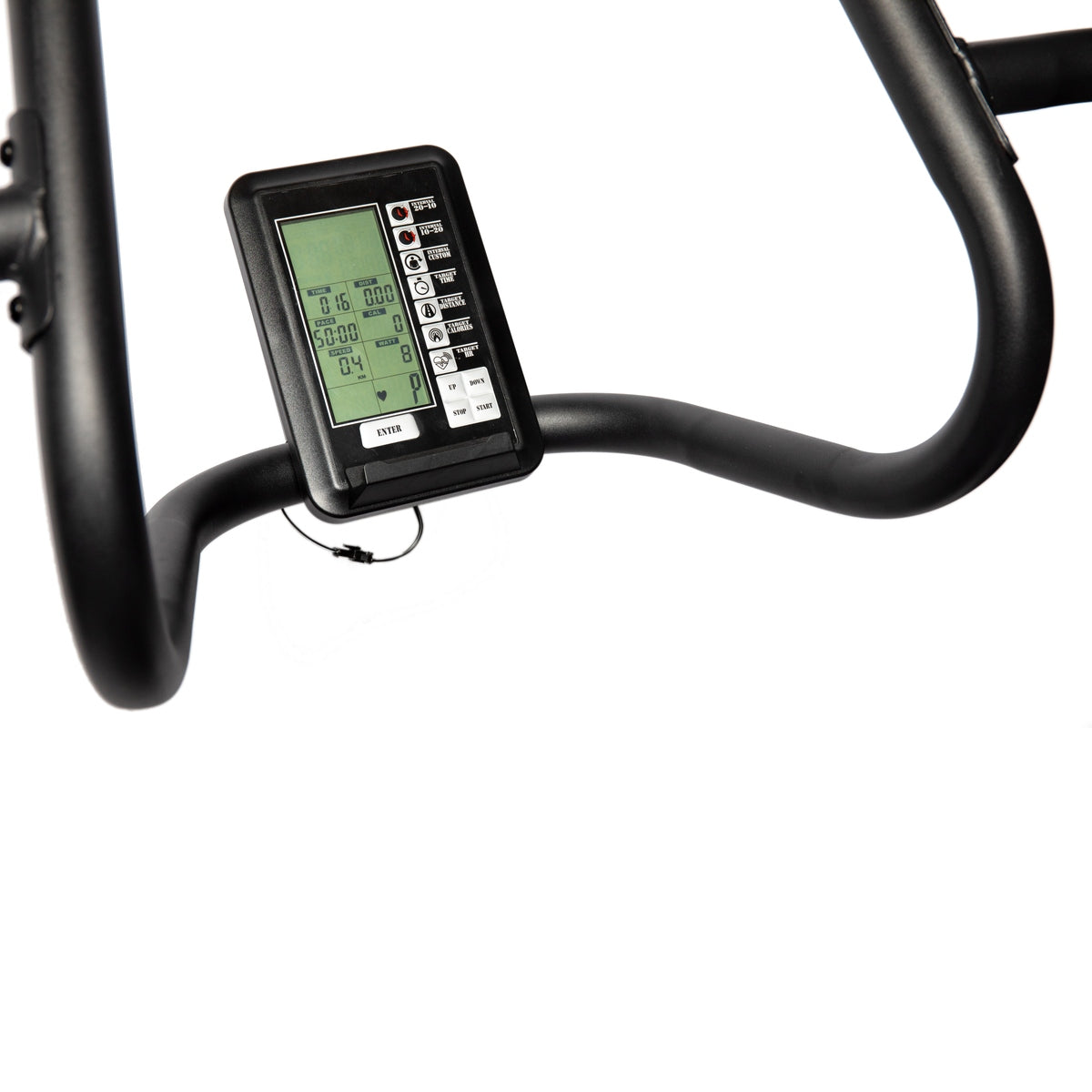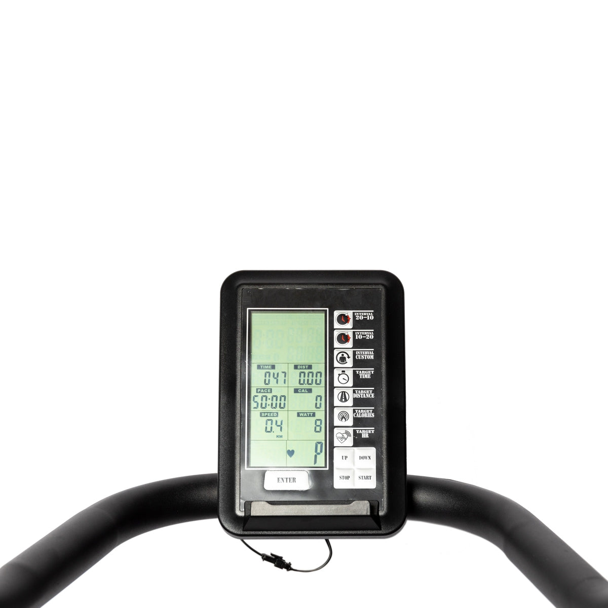 モニター部分は、単3電池4本で駆動します。タイム、カロリー、距離、ストローク数が表示され、2種類のインターバルエクササイズが選択できます。
